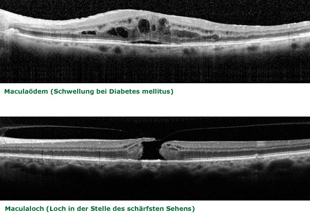 Die häufigsten, schwerwiegenden Erkrankungen des Augenhintergrundes gehen im Anfangsstadium mit einer Dickenveränderung der mehrschichtigen Netzhaut einher. Oft erst deutlich später kommt es zu Veränderungen des Sehens und somit zu merkbaren Symptomen. Auch die altersbedingte Makuladegeneration (AMD) beginnt mit Ablagerungen unterhalb der Netzhaut. Dabei kommt es zu einer Dickenzunahme, die sehr genau mit dem OCT gemessen wird. Löcher in der Stelle des schärfsten Sehens (Makulaforamen) oder auch entzündliche Veränderungen sind überhaupt nur mit dem OCT darstell- und messbar. Eine möglichst genaue Dokumentation der Ausmaße entzündlicher Netzhautanteile ist von großer Bedeutung, um frühzeitig eine Therapie planen zu können.